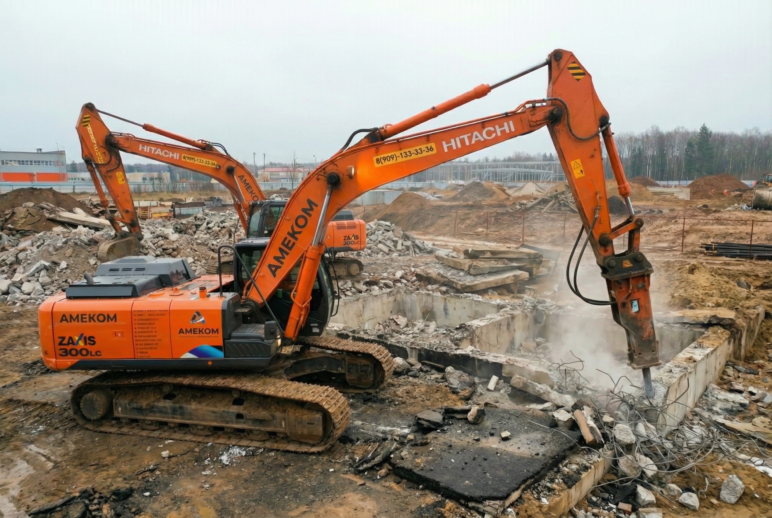 - Демонтаж старых конструкций (бетон, асфальт, фундаменты) экскаватором с гидромолотом.